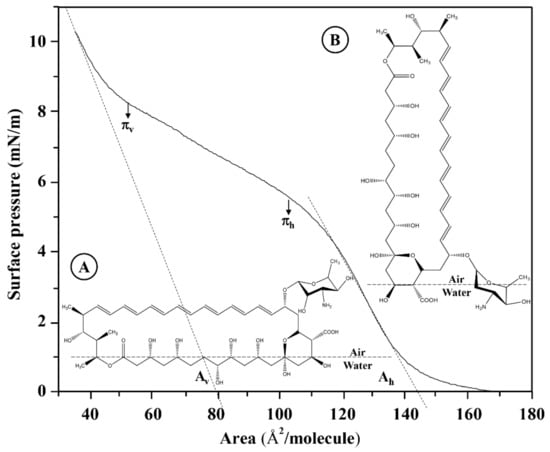 The specific molecular areas of a horizontal position (Ah) and vertical position (Av) do not depend only on the molecular reorientation model of the AmB molecules in the subphase. For the AmB molecule, a rectangular box type model has been proposed [21,33], as observed in Figure S2. Table 2 shows the experimental values of the specific molecular areas of AmB in horizontal (Ah) and vertical (Av) positions compared to the values obtained by molecular optimization at AM1 theory level.