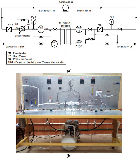 (a) Schematic flow diagram and (b) the experimental setup of the membrane-based heat exchanger for air dehumidification.