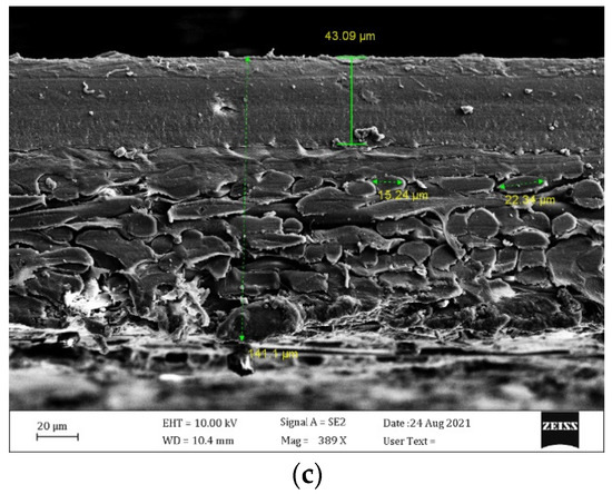 A Sigma VP FESEM microscope (Zeiss, Munich, Germany) was used to acquire FESEM images of the cross-section of these membranes. The microscopic diagrams in Figure 3 show the asymmetric texture of P-MEM and C-MEM, both with porous mechanical support on the underside. C-MEM has a fragile smooth surface of PEBAX polymer on the top cover. PEBAX is applied as a non-porous, hydrophilic, dense layer on top of the base layers. P-MEM also has a PES coating layer on the base. In contrast, kraft paper has a symmetrical porous texture.