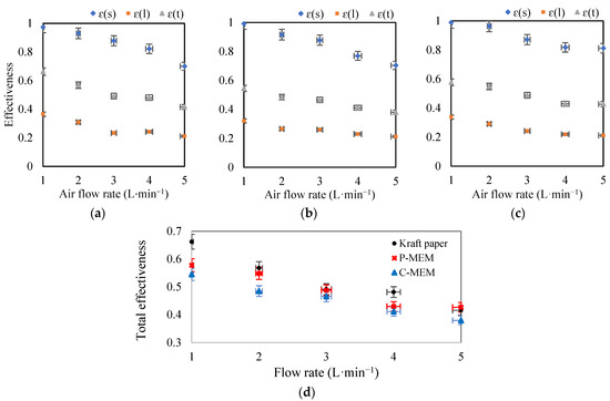 Effect of increasing air flow rates on sensible, latent, total effectiveness for (a) kraft paper, (b) C-MEM, and (c) P-MEM, and (d) comparison of the total effectiveness of different membranes at different air flow rates.