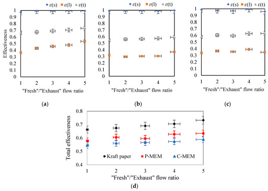Effect of increasing the flow rate ratio of “fresh” to “exhaust” on sensible, latent, total effectiveness for (a) kraft paper, (b) C-MEM, and (c) P-MEM, (d) comparison of the total effectiveness of different membranes at different fresh/exhaust air flow ratios.