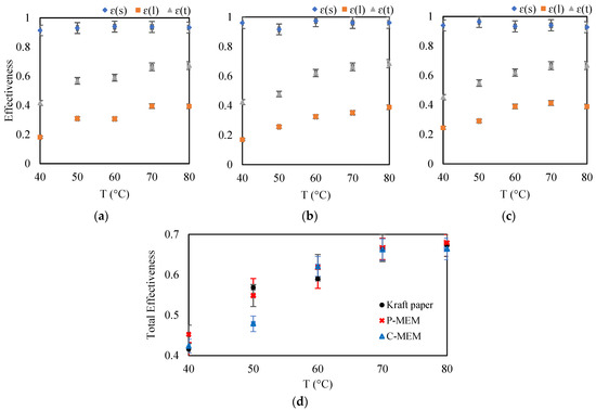 Effect of increasing the incoming humid air temperature on sensible, latent, total effectiveness for (a) kraft paper, (b) C-MEM, and (c) P-MEM, and (d) comparison of the total effectiveness of different membranes at different incoming humid air temperatures.