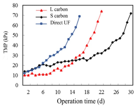 The effects of operating conditions (direct UF, S carbon, and L carbon) on the TMP variations are illustrated in Figure 1. It could be observed that the TMP increased slowly at different operating conditions in the initial stage of operation, and the TMP of the direct UF, L-UF (the enhanced reactor with L carbon addition was abbreviated as L-UF), and S-UF (the enhanced reactor with S carbon addition was abbreviated as S-UF) increased rapidly after 12, 16, and 26 days. The direct UF filtration, L-UF, and S-UF conditions lasted 15 d, 22 d, and 30 d, respectively, when serious membrane fouling occurred with the TMP above 70 kPa. Thus, after adding PAC, the operation cycle was prolonged, with the S-UF reactor exhibiting superior performance, which was probably attributed to that PAC could adsorb the organics in the reactor, thus reducing the UF membrane fouling.
