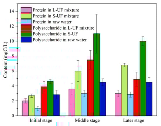 Figure 2 provides the variation of soluble EPS content in raw water, L-UF, and S-UF mixtures and Table S4 presents the ANOVA statistical analysis using Tukey’s test of the comparison of EPS concentration in terms of both protein and polysaccharide from the raw water, the L-UF and S-UF reactors in the initial, middle and later stages. As shown in Figure 2, the protein content was lower than that of the polysaccharide for the three water qualities. After adding carbon, the protein and polysaccharide content of the mixture were significantly higher than the raw water during the whole operation. It could be deduced that there were active microorganisms in the mixture, and as the operation proceeded, the content of protein and polysaccharide in the mixture of L-UF and S-UF demonstrated a trend of increasing first and then decreasing. The variation of protein and polysaccharide contents in the raw water was smaller in the middle and later stages than in the mixture, surmising that there was an increase or decrease in the proliferation and metabolism of the cultured microorganisms. Meanwhile, the EPS content of the S-UF mixture was higher than that of L-UF, especially in the middle and later stages, indicating that the microbial metabolism in S-UF was more vigorous, which might result from the favored growth of microorganisms in the larger pore volume of the S carbon.