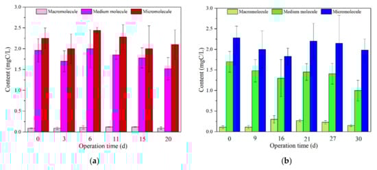 The peak area of Peakfit was used to calculate the percentage of each molecular weight range. Comparing the molecular weight content of the mixture in the L-UF and S-UF mixing tanks (Figure 3a,b), it could be seen that the content of both macromolecules increased and then decreased. The variation of medium and small molecules was the same, and they were decreasing first, then increasing, and then decreasing. This phenomenon may be attributed to the microbial activity and the fluctuation of raw water quality. The medium molecular content of the S-UF mixture was lower than that of L-UF. The reason may be as follows, i.e., PAC showed an obvious adsorption effect at the initial stage of operation, especially for adsorbing small molecular substances, but the adsorption was quickly weakened, and the amount of carbon added per day was small, relying solely on PAC; the addition of PAC was beneficial to the growth of microorganisms, and in the process, microorganisms selectively consumed a higher proportion of smaller molecular weight organic matter, synthesized, and produced macromolecular substances during metabolism. The separation principle of the UF membrane made it easier to retain large molecules. Therefore, the macromolecular organic matter was accumulated in the mixing tank, and the decrease in the later stage may be due to the influence of the decrease of the microbial metabolic rate and the fluctuation of the raw water quality. It has been reported that PAC particle size significantly affects the growth environment of microorganisms in the system [31,32]. The smaller the PAC particle size, the more obvious the growth of microorganisms in the system was inhibited. As shown in Figures S1–S3, comparing with the L carbon, the S carbon has a larger average particle size and a relatively larger pore volume in 0–5 nm and over 30 nm. The larger particle size and pore volume of S carbon may provide a more favorable growth environment for microorganisms. Therefore, more microbes, more metabolism, and more synthetic macromolecules were produced in the S-UF reactor.