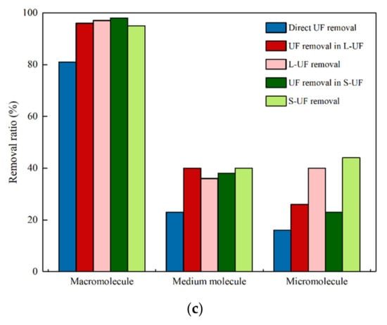 From the removal ratio results, as shown in Figure 3c, the direct UF filtration had a good retention effect on macromolecules, with a removal ratio of over 80%. After adding activated carbon, the removal ratio increased to 96% or even more. UF membranes have the ability to retain medium and small molecules, especially for small molecules (less than 20%). This was owing to that membrane filtration was one of the mechanical actions, which included adsorption, blockage, and mechanical retention [33]. Contaminants with particle size larger than the membrane pore size could be effectively retained [34]. Clearly, the addition of PAC enhanced the removal effect of NOM. Regardless of the carbon added, the total removal ratio of the effluent from large, medium, and small molecules relative to raw water was increased compared with direct UF filtration, and the removal ratio of small molecules was the largest. After being activated by PAC, it exceeded 40%. However, the removal ratio of small molecular substances exhibited a minimum value. This was attributed to the fact that the composition of the mixture after carbon addition had a significant reduction in small molecules, and some weakly polar and biodegradable small molecular organic substances were consumed by the activated carbon adsorption and biological metabolism [35].