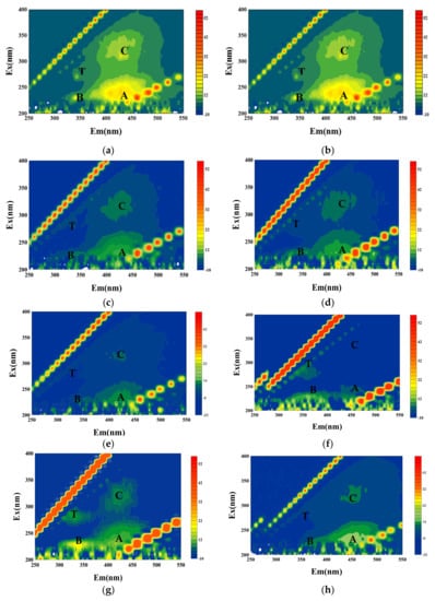 EEM spectra of the water sample of raw water, effluent, and mixing tank under different conditions: (a) raw water; (b) direct UF filtration, effluent; (c) L-UF, initial mixture; (d) L-UF, middle and later mixture; (e) L-UF, effluent; (f) S-UF, initial mixture; (g) S-UF, middle and later mixture; and (h) S-UF, effluent.