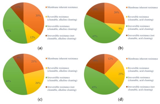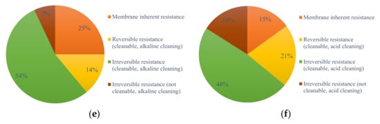 The ratio of the resistance of the membrane after cleaning: (a) direct UF filtration, alkaline cleaning; (b) direct UF filtration, acid cleaning; (c) L-UF, alkaline cleaning; (d) L-UF, acid cleaning; (e) S-UF, alkaline cleaning; and (f) S-UF, acid cleaning.