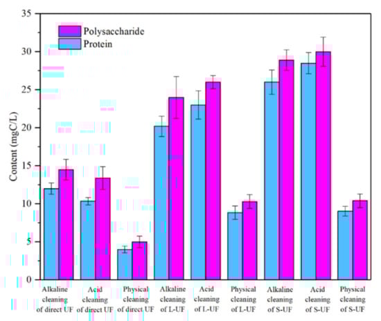 The content of soluble EPS in the cleaning solution is shown in Figure 6, with the ANOVA statistical analysis using Tukey’s test of the comparison of EPS concentration in terms of both protein and polysaccharide from the direct UF, L-UF, and S-UF reactors with the physical, acid, and alkaline cleanings are presented in Table S7. Comparing the EPS concentration in the membrane elution from L-UF and S-UF reactors with that from the direct UF reactor, the three cleaning protocols all behaved significantly differently. While comparing the EPS concentration in the membrane elution from the L-UF reactor with that from the S-UF reactor, the alkaline cleaning exhibited significantly different, and the physical cleaning was not. While the acid cleaning behaved statistically significantly different for the proteins in the membrane elution but did not for polysaccharides. As shown in Figure 6, the content of polysaccharide and protein in the cleaning solution of each working condition was higher than that of the previously tested mixture and raw water, indicating that the polysaccharide and protein contributed greatly to membrane fouling. As depicted in Figure 6, the content of EPS in the direct UF filtration was the lowest, and the highest in the S-UF. Meanwhile, the EPS content of the cleaning solution after acid cleaning was slightly higher than that of the alkaline cleaning, indicating that the acid cleaning was more likely to elute polysaccharide and protein.