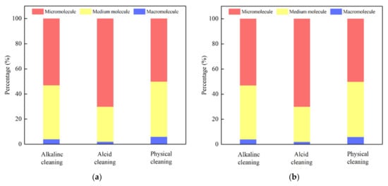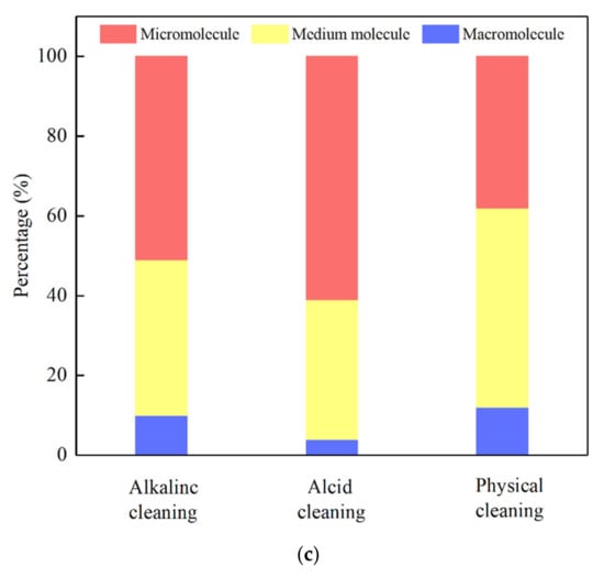 Among the alkaline cleaning of L-UF, the proportion of medium molecules was the highest, and the other elution had the highest proportion of small molecules, indicating that the small molecules were more likely to cause irreversible fouling of the membrane. In addition, the proportion of small molecules in the acid cleaning solution was the highest among the three cleaning methods, again demonstrating that acid cleaning made it easier to elute small molecular organics [36].