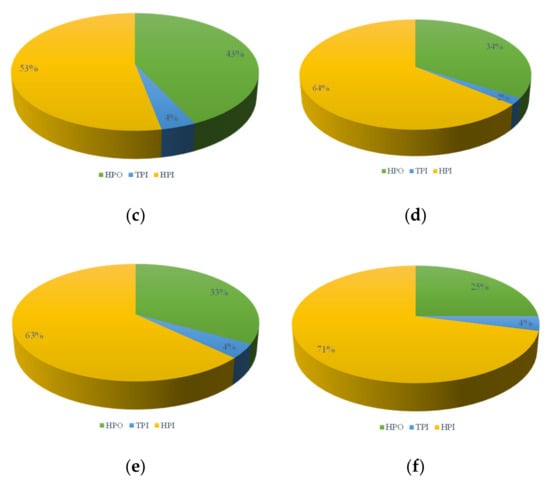 Proportion of hydrophilic and hydrophobic components: (a) direct UF filtration, alkaline cleaning; (b) direct UF filtration, acid cleaning; (c) L-UF, alkaline cleaning; (d) L-UF, acid cleaning; (e) S-UF, alkaline cleaning; (f) S-UF, acid cleaning.