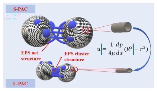Compared with the L carbon with the smaller particle size and the lower BET, the S carbon with the larger particle size and the higher BET exhibited superior performance in prolonging the UF filtration process, which suggests that the membrane fouling could be better controlled. Since the small PAC particle size could inhibit the growth of microorganisms in the mixed liquor, the S carbon with a larger particle size and pore volume (d > 30.0 nm) provided a more favorable growth environment for microorganisms and covered more EPS on their surface. Therefore, the particle size of the S carbon mixed liquor also increased as the filtration process proceeded. At the end of the filtration, the S carbon cake layer that formed on the UF membrane surface and contained the highest quantity of EPS (i.e., hydrophilic substances, polysaccharide, and protein) could alleviate irreversible fouling effectively. Thus, particle size and pore structure are the two key parameters that should be considered for the PAC addition during the UF filtration process, which can also be analyzed with the Hagen–Poiseuille equation, as shown in Figure 9.