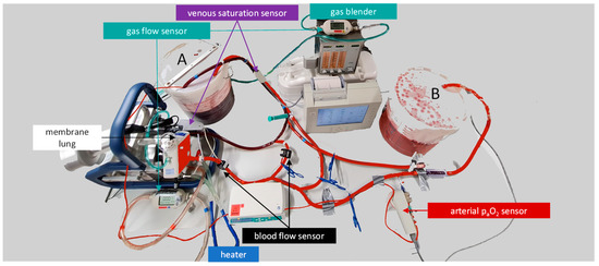 In general, there are three types of mock models for extracorporeal lung support: continuous measurement systems with a closed-loop system or with a dual-loop system, both mainly used for simulation of extracorporeal carbon dioxide removal (ECCO2R) and discontinuous measurement systems [6,10,11,12,13]. CO2 removal of a membrane lung is mainly determined by the sweep gas flow and can be sufficiently performed at low blood flow rates [14]. In our previous publications [13,14], we demonstrated ECCO2R mocks that consisted of a test circuit connected to another circuit with another membrane lung, the primary circuit. The membrane lung in the primary circuit can continuously remove oxygen and add CO2 with a sweep gas of nitrogen and CO2. As a result, venous blood for the ECCO2R in the test circuit was continuously supplied. However, this approach is not sufficient for an ECMO model with its higher blood flow [15] and oxygen intake because the ability to remove oxygen in those mocks is too low. In fact, it is much harder for a membrane lung to remove oxygen from blood than to add it. The reason for this is the higher diffusion gradient for O2 from pure oxygen gas to venous blood compared to the gradient for O2 from arterial blood to a nitrogen carbon dioxide gas mixture. In the mentioned ECCO2R mock, if the blood flow in the test circuit exceeded 1.5 L/min, the oxygen-removing membrane would be unable to remove that much oxygen, no matter how high the N2 sweep gas rates were set. As a result, the saturation of the blood at the intake of the ECCO2R or ECMO to be tested would rise to a point where it could no longer be called venous.