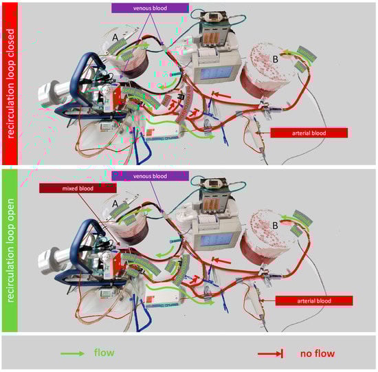 Test setup to measure the effect of a recirculation loop on the oxygen transfer rate of the membrane lung. Both schematic illustrations show the mock circuit during the measuring sequence. In the upper illustration, the recirculation loop is closed. The membrane lung has venous blood as input. In the lower illustration, the recirculation loop is open and transfers arterial blood that already passed the membrane lung back to the inlet of the pump. The membrane lung has mixed blood as input. In both setups, the oxygen transfer rate of the membrane lungs is calculated from the cannula blood flow, the hemoglobin value, the venous saturation (bucket A), and the arterial oxygen pressure (bucket B).