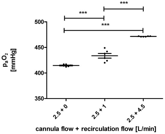 The measured oxygen pressure (paO2) at the arterial sensor of the ECMO for a cannula blood flow of 2.5 L/min and blood flows over the recirculation loop of 0 L/min, 1 L/min, and 2.5 L/min are highly significantly different (***).