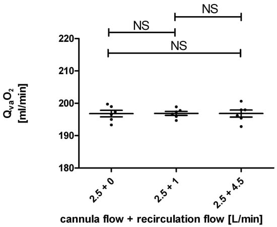 The calculated oxygen transfer rates over the membrane lung (QvaO2) for a cannula blood flow of 2.5 L/min and blood flows over the recirculation loop of 0 L/min, 1 L/min, and 2.5 L/min are not significantly different (NS).