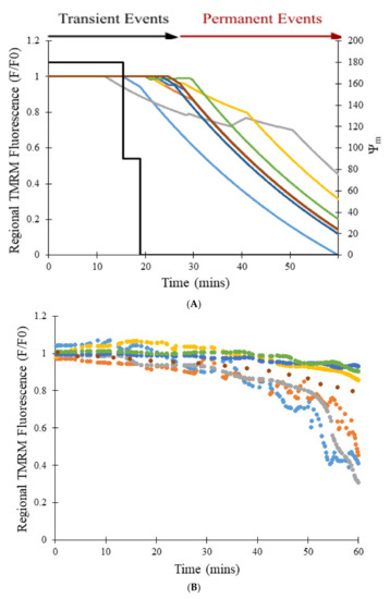 Figure 9A shows the transition from transient to permanent opening events over time as photon stress increases in different cells, which models the experimental data represented in Figure 9B [7]. The transition rate to the permanent open state is proportional to the number of pores in the transient open state, as expected by Equation (8), and this dependence becomes steeper as [ROS] increases with time (in control and CsA simulations). In the model, photon stress increased ROS levels by the differential Equation (13), the rate at which mPTP transitions from the transient open state to the permanent open. Figure 9C shows the impact of increased photon stress on the TMRM fluorescence over 60 min. The number of simulated transient events decreases after ~30 min since there are fewer pores available to make the transition due to the accumulation in the permanent open state.