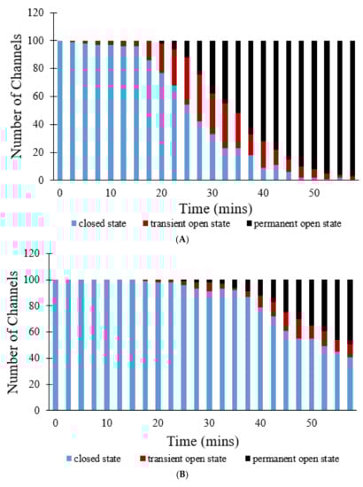 Figure 13 shows the number of pores in the transient open state for a single mitochondrion. In a mitochondrion with 10 pores, as the simulation progresses, and [ROS] increases there is almost always at least one channel open after 20 min as demonstrated in Figure 13A. By contrast, in a mitochondrion with only 1 pore as shown in Figure 13B, there can be times when there is no pore in the open state and the mitochondrion membrane potential can recover until around 50 min. Overall, such simulations indicate that once the number of pores is five or higher, the chance of all pores being closed is unlikely, in effect leading to a transition to a permanently depolarized state.