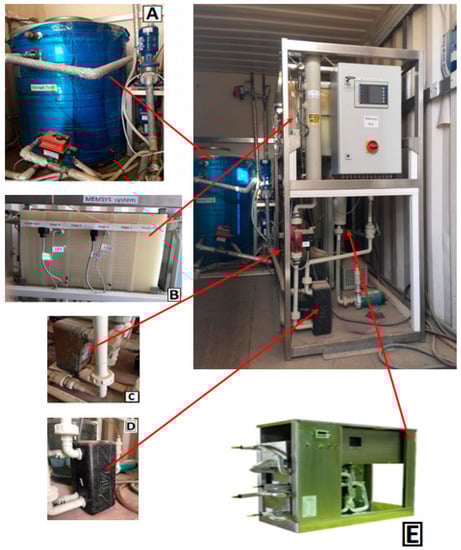 Photographs of the V-MEMD system facilities. (A) Thermal storage tank, (B) multiple effects, (C) HX-2, (D) HX-1, and (E) heat pump system.