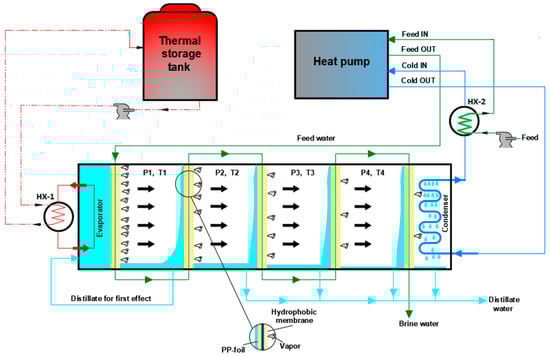 Lately, a handful of research has focused on studying how to enhance distillate production and reduce energy use, both thermal and electrical [9,10,11]. Numerous pilot plants were designed and integrated with renewable energy sources [9,10,11,12,13,14,15,16]. Such as solar energy, geothermal energy, and waste energy. However, productivity is still limited, associated with high thermal and electrical energy intake per volume of production [17]. Other practitioners and researchers studied improving membrane distillation efficiency by recycling thermal energy via using multiple-effect MD (MEMD) systems. One of those innovative ideas was increasing the number of effects to extract the largest amount of distillate water, as studied in [10,12,13,14,15,18]. Moreover, among those innovative ideas is preheating the feed stream by outlet streams (i.e., cooling, distillate, and brine stream) as investigated in [10,12,13,14,15,18]. Another pioneering idea is using the heat pump system to preheat the feed stream by leveraging the heat rejected from the heat pump system through the condenser, as explained in [10,19]. Moreover, the development of the efficiency of fabricated membranes is one of the important factors that played a positive role in improving the distillation process, as reported in previous works [20,21].