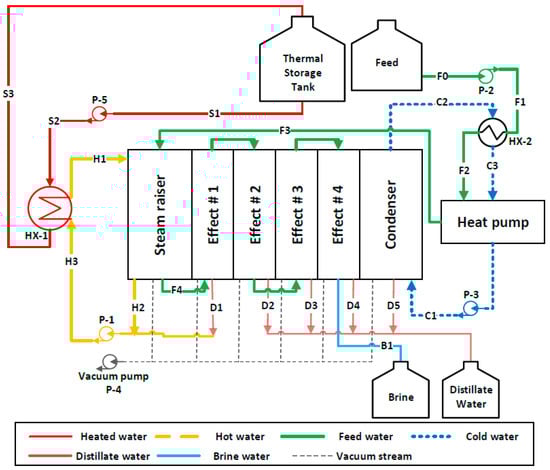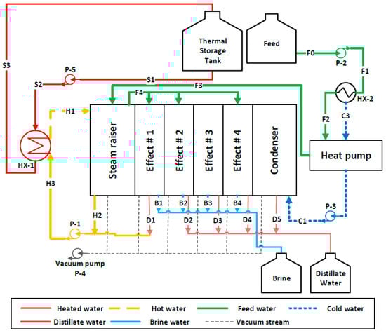 The concept of desalination using MD technology is based on phase change due to applying thermal energy (i.e., heating and cooling energy) as applied to conventional systems (e.g., multi-effects distillation (MED) and multi-stages flash system (MSF)). As shown in Figure 3 and Figure 4, the heated water stored in the thermal storage tank is fed to the V-MEMD unit via an HX-1, which exchanges thermal energy with the hot water stream (H1) to raise its temperature to the desired temperature (TH1). Since the V-MEMD unit operates under vacuum pressure, the hot water in the evaporator compartment contributes to heat up the feed water (F3) and, at the same time, drives the latent heat to the next effect by the extracted vapor, and then the vapor condenses (D1) to reserve a mass of the hot water. The procedure of driving the latent heat is replicated in cascade effects to continuously provide the thermal energy to the feed water that loses its heat as a result of evaporation. Two different configurations of the V-MEMD unit were used in this study; the main difference between them is the way the feed water flows through the cascade effects. Forward-flow configuration (FFC) in experimental works was investigated [10,19] and theoretically studied by Najib et al. [24]. With regard to this configuration, the feed water flows through cascade effects by moving from one effect to the next effect, where circulating water loses a portion of its mass and heat and ends up in brine water (B1), as shown in Figure 3. The second is the cross-flow configuration (CFC). The feed water after leaving the evaporator compartment (F4) is evenly distributed over all effects. An advantage of this feed-flow pattern is that the feed water enters the effect at a high temperature and low flow rate, which facilitates the compensation of the thermal energy of the feed water in the channels by the thermal energy driven by the previous effect. Each branch of the feed water ends up as brine water (B1, B2, B3, and B4), as shown in Figure 4. The cooling energy driven by the heat pump unit effectively contributes to removing the heat accumulated in the condenser compartment. This allows expansion of the thermal energy throughout the cascade effects of the V-MEMD unit (i.e., more productivity). The heat rejected by the heat pump system and HX-2 effectively contributes to minimizing the thermal energy supplied to the V-MEMD unit via preheating the feed water flow (F1 and F2), as illustrated in Figure 3 and Figure 4. The abbreviations of the V-MEMD components used in Figure 3 and Figure 4 are shown in Table 2.