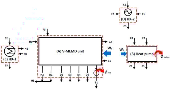 Specification of control volumes for major components: (A) V-MEMD unit, (B) heat pump system, (C) HX-1, and (D) HX-2.