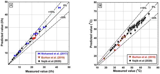 The experimental data generated from the V-MEME setup are used to validate the mathematical model. The validation results cover a wide range of operating conditions with maximum relative uncertainty for all variables, as specified in Table 3. BnR PLC was used to control the V-MEME unit and record process parameters except for the feed salinity. Feed salinity was measured manually using HANNA portable device. Figure 6 shows a comparison between experimental measurements and numerically predicted values of the mathematical model. Each data point denotes a unique operating condition specified in Table 3. Furthermore, the mathematical model results were also verified against Burhan’s results [27] and Mohamed’s results [9]. Generally, an excellent model-plant agreement is obtained. As shown in Figure 6A, the model-predicted distillate water production rate over the entire range of operating conditions is within a ±15 deviation band. The observed discrepancies may be attributed to three reasons: (i) knowledge of the mass and heat transfer processes in the spacer-filled channels, (ii) modeling assumptions, and (iii) fluctuation of recording parameters. As far as the predicted temperatures are concerned, they are in excellent agreement with the experimental measurements. The maximum model-plant discrepancy does not exceed the ±15 deviation band, as described in Figure 6B.