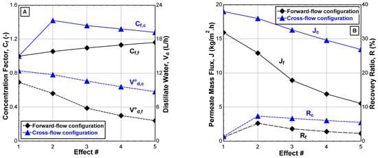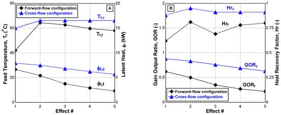 Figure 8 shows the variation of internal performance indicators related to thermal energy through the cascade effects. The advantage of the CFC in thermal energy came from feeding all effects with water solution having the same temperature (TF4~66.2 °C) as applied in conventional desalination systems [22]. This enhances the latent heat transfer through the cascade effects, as shown in Figure 8A, as well as the other performance indicators, as shown in Figure 8B. The average enhancement percentages of heat recovery factor, Hr, gain output ratio, and GOR relative to maximum values of FFC can reach up to 28% and 60%, respectively. However, the latent heat gradient is still observed through the cascade effects of both configurations but with different slopes; their reduction percentages can reach 9% for the CFC and 25% for the FFC.