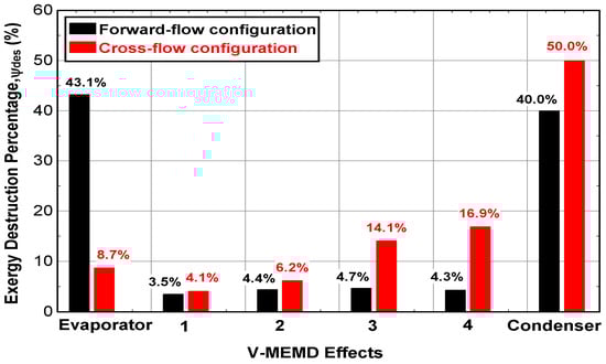 Exergy destruction percentage through the cascade effect of the V-MEMD unit ( = 900 L/h, = 75 °C, = 405 L/h, = 20 °C, = 159 L/h, = 1260 ppm, and = 11.5 kPa).