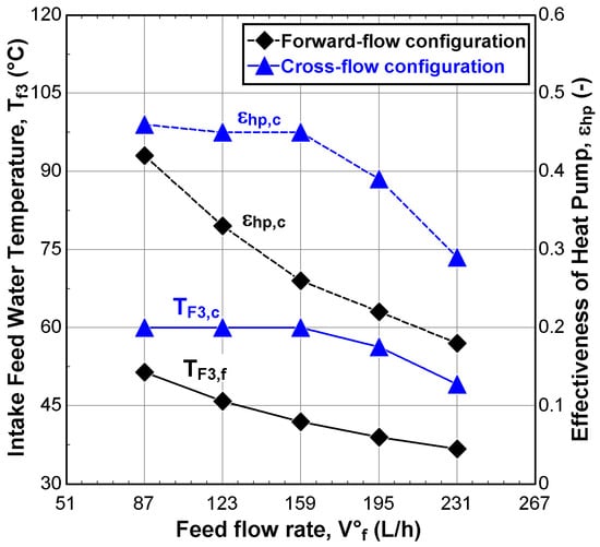 Effect of the feed water flow, on the feed water temperature and the effectiveness of the heat pump system ( = 900 L/h, = 75 °C, = 405 L/h, = 20 °C, = 1260 ppm, and = 11.5 kPa).