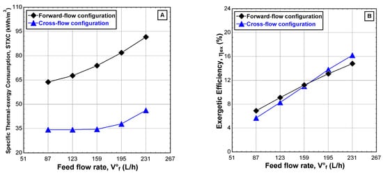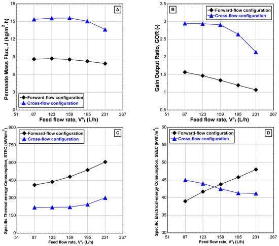 According to the results obtained from Figure 10, increasing feed water flows negatively affected the global performance indicators for both configurations with some preference for CFC. The enhancements of TF3 and in CFC are probably up to twice as much as in FFC. Indeed, the behavior of the FFC was expected, as addressed by Najib et al. [10,24,29]. Figure 11A–C showed stability in the permeate mass flux, J, gain output ratio, GOR, and specific thermal energy consumption, STEC, for CFC when the feed water flow is less than 159 L/h; where their corresponding values can approach 15.5 kg/m2·h, 2.94, and 220 kWh/m3, respectively. The reason for this behavior is most likely to invest the heat rejected from the heat pump system into preheating the feed water. Interestingly, the performance indicator related to electrical energy (SEEC) is the best in FFC when the feed water is less than 159 L/h. Due to the low consumption of electrical work spent in the heat pump system to remove the heat accumulated in the last effect of the V-MEMD unit. On the contrary, SEEC exhibits better behavior in CFC when the feed water flow was greater than 159 L/h as a result of the low heat rejected from the heat pump system, as shown in Figure 11D.