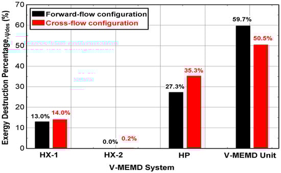 Exergy destruction percentage of the main components of the V-MEMD system ( = 900 L/h, = 75 °C, = 405 L/h, = 20 °C, = 159 L/h, = 1260 ppm, and = 11.5 kPa).