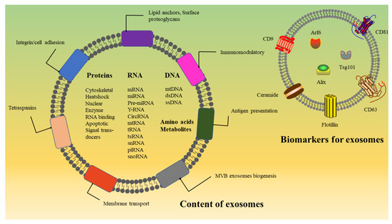 According to the size of extracellular vesicles (EVs) and their biogenesis, EVs can be roughly categorized into three types [18,28,29]: (1) Apoptotic bodies, about 1–5 μm in diameter, are formed by apoptotic cells in the form of plasma membrane budding. (2) Microvesicles, about 100–1000 nm in diameter, are formed by direct outward budding from the plasma membrane. (3) Exosomes, about 30–150 nm in diameter, are produced by the fusion of multivesicular bodies produced through the endosomal pathway with the plasma membrane.
