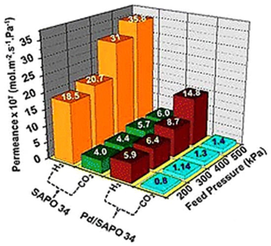 | SAPO-34 (M1) | Stainless steel | 1.1 × 10−7 mol/(m2 s Pa) | 27 | - | [117] |