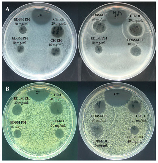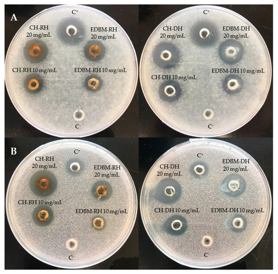 The inhibition zones induced by CH-RH, CH-DH, EDBM-RH and EDBM-DH at 10 and 20 mg/mL against Staphylococcus aureus and Kocuria rhizophila are presented in Figure 3. Hydrolysates at 20 mg/mL induced larger inhibition zones than hydrolysates at 10 mg/mL.
