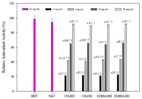 β-carotene bleaching inhibition activity of bovine hemoglobin hydrolysates at different concentrations in CH-RH, CH-DH, EDBM-RH and EDBM-DH. Values with (*) symbol are significantly different from BHT; values with (†) symbol are significantly different from neokyotorphin; values with different lowercase letters (a–c) within the same concentration are significantly different; values with different capital letters (A–D) within the same condition are significantly different (p < 0.05, Tukey test).