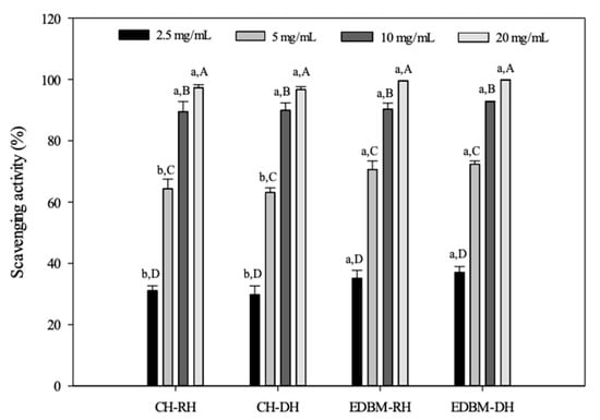 ABTS scavenging activities of bovine hemoglobin hydrolysates in CH-RH, CH-DH, EDBM-RH and EDBM-DH at different concentrations. Values with different lowercase letters (a,b) within the same concentration are significantly different; values with different capital letters (A–D) within the same condition are significantly different (p < 0.05, Tukey test).