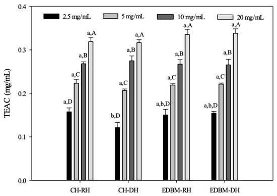 Total antioxidant capacity of bovine hemoglobin hydrolysates in CH-RH, CH-DH, EDBM-RH and EDBM-DH at different concentrations. Values with different lowercase letters (a,b) within the same concentration are significantly different; values with different capital letters (A–D) within the same condition are significantly different (p < 0.05, Tukey test).