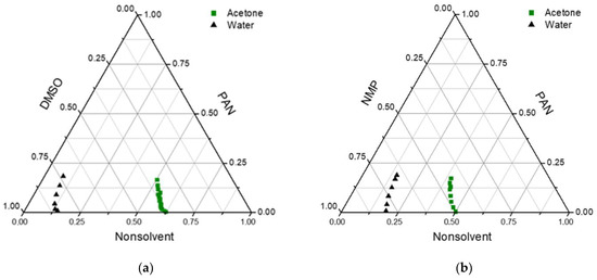 Three-component phase diagrams of the PAN/solvent/acetone and PAN/solvent/water systems were obtained at 25 °C by determining cloud points. PAN solutions of various concentrations were prepared in containers and titrated under constant stirring at 25 °C. The titrant, which was in the burette, was added dropwise until the stirred solution became cloudy. The cloud point was fixed when the cloudiness of the polymer solution did not disappear within 24 h [35,36].