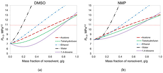According to the phase diagrams, in the case of DMSO, acetone can be added to a solution with a higher concentration than in the case of NMP. This can be explained by the fact that, according to Hansen solubility parameters, DMSO is a better solvent for PAN than NMP (Table 1). The calculation of distance in Hansen space between PAN and a binary solvent consisting of two liquids, calculated according to [39], gave a good correlation with the cloud point data (Figure 2). For NMP, RP-S became higher than the PAN solubility radius when the mass fraction of acetone was higher than 0.5, and cloud points were obtained at the same concentrations. For DMSO, this concentration was 0.65.