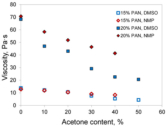 Experimental measurements of the dynamic viscosity of PAN solutions in mixtures with acetone demonstrated that the addition of acetone decreased the viscosity of the polymer solution (Figure 3). In the case of DMSO, the drop in viscosity was more distinct, which could be associated with the higher intrinsic viscosity of DMSO. The addition of a low-viscosity component had a more significant effect on the viscosity of the resulting fluid.