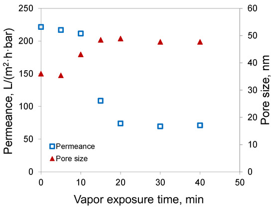 It is interesting to note that the results for the membrane pore size (see Figure 4) demonstrated that the water vapor started to affect membrane morphology at the contact time of 10 min, with an increase of pore size from 35 up to 43 nm; meanwhile, the membranes demonstrated about the same pore size of 48–49 nm at the exposure time of 15 min or greater.