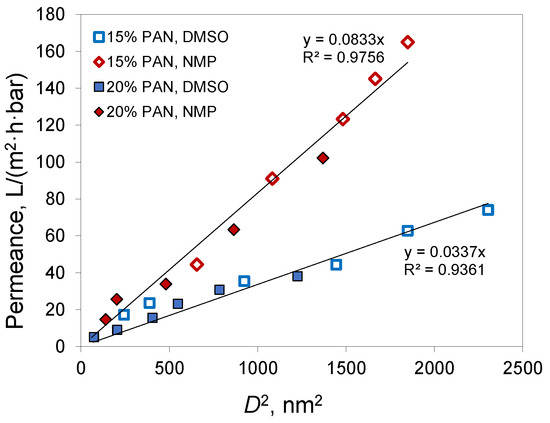 Unlike NIPS, membranes prepared using the VIPS method do not have finger-like macrovoids and a spongy structure usually forms. Depending on the preparation conditions, membranes obtained using the VIPS method can have a bicontinuous, cellular, or nodular structure [40]. SEM images confirmed the absence of macrovoids in the membranes obtained via the VIPS method (Figure 6). For the membranes prepared from a 15% PAN solution in DMSO, a cellular structure was observed, while for other membranes SEM resolution did not allow the membrane structure to be distinguished. At the same time, the plot of membrane permeance versus pore diameter (D) squared (Figure 7) showed a linear dependence for both solvents used for membrane preparation.
