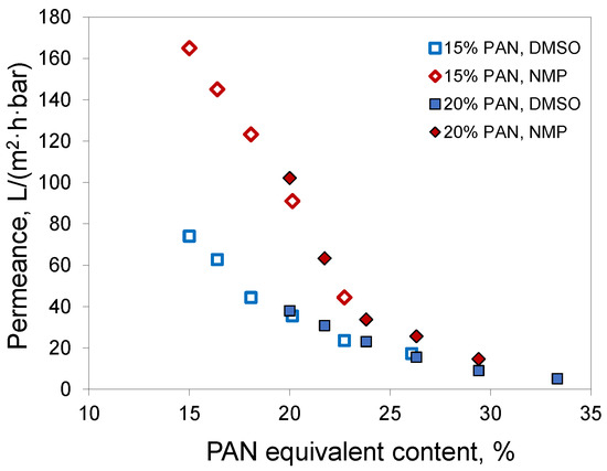 Since acetone mostly evaporates from the polymer film before precipitation, the phase separation follows the same path as if a polymer solution without acetone, but with a higher PAN concentration, was employed to prepare the membrane. For brevity, we denote this concentration as PAN equivalent content. This is not the PAN concentration at the precipitation moment, since it does not consider water uptake and assumes full acetone evaporation. In the case of a 20% PAN solution in DMSO/acetone 50/50, the equivalent content was 33%. For 15% PAN solutions at the acetone/solvent ratio of 30/70, the equivalent content was nearly 20%. If full acetone evaporation takes place before phase separation starts, then the characteristics of the membranes should correspond to those of membranes obtained from solutions with the same PAN equivalent content. A comparison of membranes obtained from solutions of 15% PAN in DMSO/acetone 70/30 and NMP/acetone 70/30 with the corresponding membranes from 20% PAN solutions in DMSO and NMP without acetone confirmed this assumption (Figure 8). The membranes obtained using the same solvent and similar PAN equivalent content had similar permeances. In the case of DMSO, the membranes had a permeability of 35 and 38 L/(m2·h·bar) at a pore size of 30 and 35 nm, respectively. In the case of NMP, similar parameters were 91 and 102 L/(m2·h·bar) with a pore size of 33 and 37 nm. Apparently, the tendency for the membranes with acetone addition to have slightly smaller pore size and permeance was due to the fact that not all the acetone evaporated.