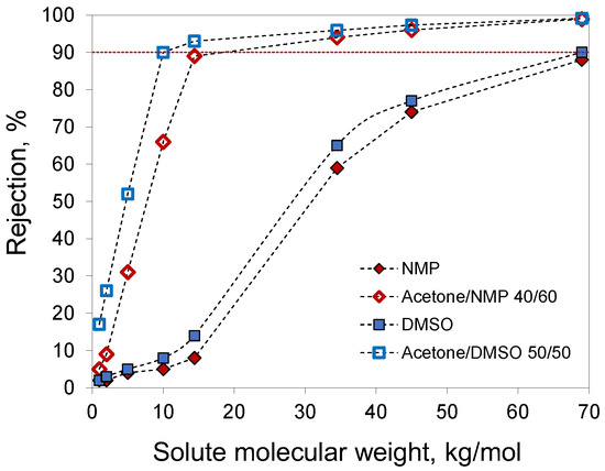 For membranes prepared from 20% PAN solutions in NMP, acetone/NMP 40/60, DMSO, and acetone/DMSO 50/50, the molecular weight cut-off (MWCO) was determined using solutes with different molecular weights in water (Figure 9). Membranes prepared with the addition of acetone demonstrated higher rejections due to the smaller pore size. The extrapolation of the obtained data to a rejection of 90% gave an MWCO of 10 kg/mol for the membrane prepared from a 20% PAN solution in acetone/DMSO 50/50. The other studied membranes had MWCO values of 18.4 and 69 kg/mol for acetone/NMP 40/60 and DMSO, respectively. For membranes from 20% PAN solution in NMP, MWCO values were not determined due to lower rejection.