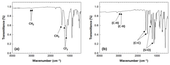 Table 1 summarizes the XPS atomic compositions of filters A and B. The atomic concentration of filter A comprised 66.2% carbon, 18.4% fluoride, and 14.5% oxygen along with traces of Si, Zn, and Ca. The atomic concentration of filter B had a carbon, oxygen, and sulfur distribution of 74.2, 22.9, and 2.9%, respectively. Not only was the chemical composition examined using ATR-FTIR, but also major functional groups of sterile filters, as shown in Figure 2. CH2 peaks at 2980 and 3024 cm–1 in filter A were observed. Another peak of A at 1403 cm–1 corresponded to CH2 and peaks at 1300–1100 cm−1 corresponded to CF2–CF2 stretching [18]. The major peaks for B such as C–H stretch at 3094 and 3065 cm−1, C=C stretches at 1572 and 1487 cm−1, S=O bands at 1303 and 1146 cm−1 can be observed [19]. The FTIR spectra correlated with the XPS composition data. Based on the XPS and FTIR analysis, filter A was a polyvinylidene fluoride (PVDF) filter and filter B was a polyethersulfone (PES) filter. The measured data showed consistency with previously reported data for PVDF and PES surfaces [20,21].