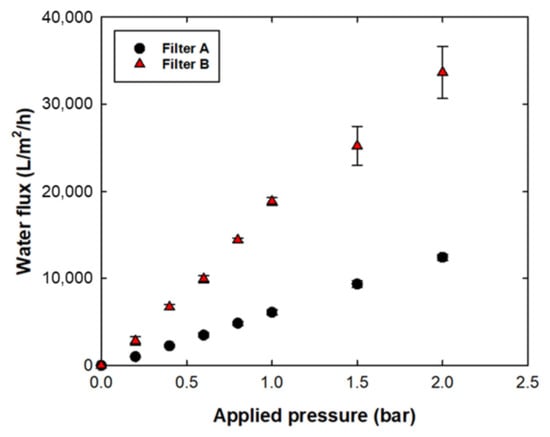 Figure 3 shows the water flux vs. applied pressure of filters A and B. To measure water flux, the change in the weight of the permeate sample was recorded every minute until 300 mL of permeate was obtained. The water permeability of filters A and B was 6300 LMH/bar and 17,000 LMH/bar, respectively. The faster water permeability of filter B compared with that of filter A could be explained by the pore structure with hydrophilic surface characteristics. The asymmetric filter structure with the extremely open and porous region of filter B enhanced the solution permeability [17]. In addition to the structural differences, the hydrophilic surface of filter B facilitated faster water transport than that of filter A [24].