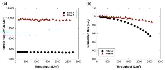 where t is the time, V is the permeated volume at t, Q0 is the initial flow rate, and Vmax is the calculated maximum filtrate volume. The slope of t/v vs. t was determined as 1/Vmax (Figure S4), and the calculated Vmax was 1667 L and 5000 L for filters A and B, respectively. The higher filter capacity was expected owing to the higher filtrate flux of filter B [17,26]. Based on the LB broth data, the fouling propensity seemed higher with filter A, regardless of a lower initial flux compared with that of filter B.