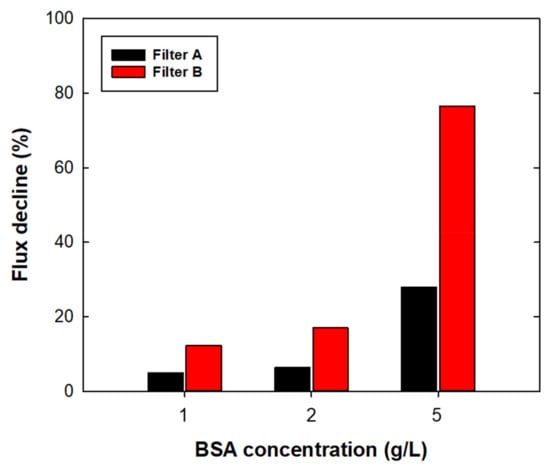 Flux decline (%) as a function of BSA concentration at 1, 2, and 5 g/L using filters A and B for the final fill. Values were obtained from BSA flux data at 10 min of operation time.
