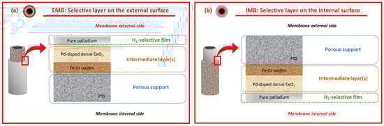 For the membrane preparation, symmetric 316L porous stainless steel (PSS) supports from Mott Metallurgical Corp. (Farmington, CT, USA) with cylindrical geometry were used. The original supports have an average porosity of ca. 20% and a media grade of 0.1 μm, which implies that 95% of the solid particles greater than this value can be rejected. These porous supports, with an external diameter of 12.9 mm, have a wall thickness of 1.9 mm. The original tubes were cut into smaller pieces of around 30 mm in length before starting the synthesis procedure. After that, the general preparation procedure includes the next successive steps: initial cleaning, calcination in air, incorporation of a ceramic intermediate layer, and Pd deposition by electroless pore-plating (ELP-PP). Despite maintaining a common fundamental composite-membrane structure based on diverse stacked layers (i.e., Fe–Cr oxides, CeO2, and palladium), its particular conformation varies according to the position of the Pd-film, on the external or internal surface of the tubular PSS support. In this context, Figure 1 schematically illustrates both alternatives, denoting the membranes as EMB or IMB in the case of incorporating the layers on the external or the internal surface of original supports, respectively.